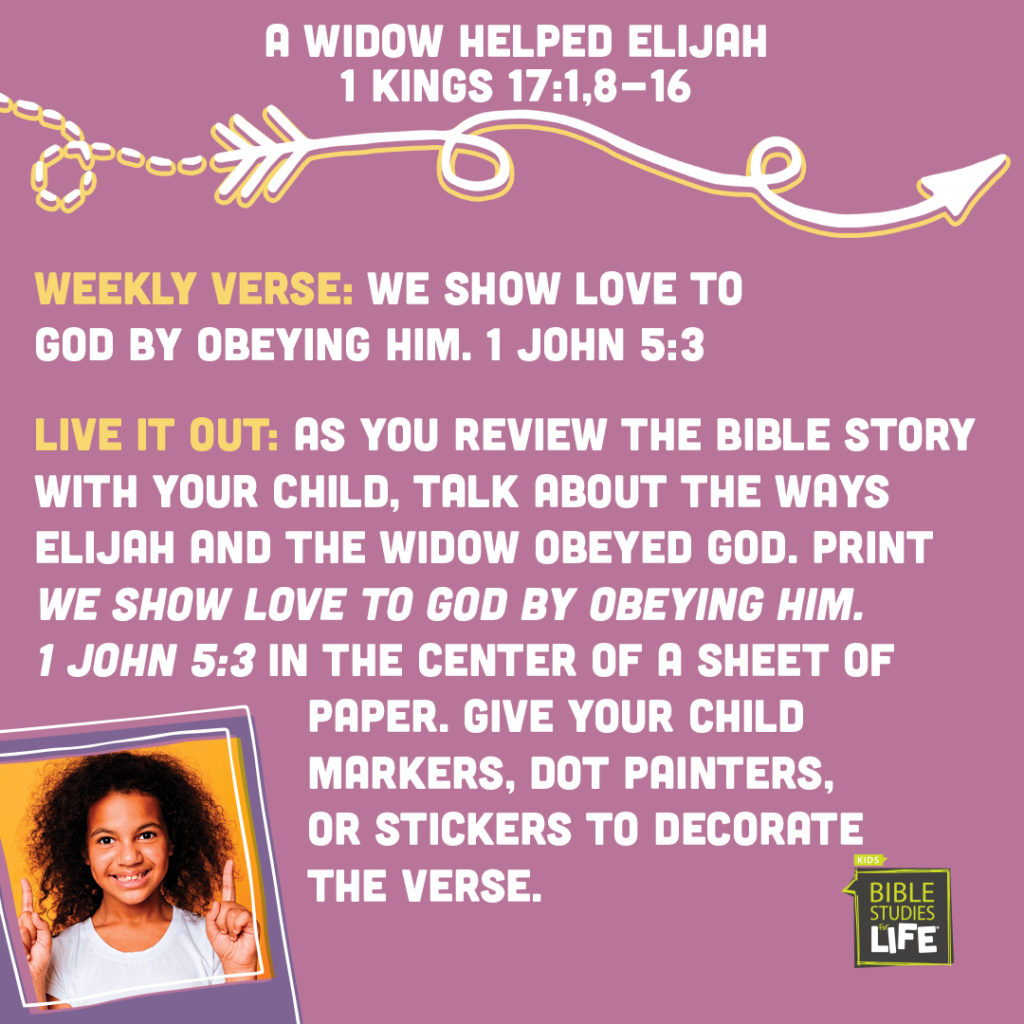 Social Media for week of February 16 Parents, today your child learned that people show love to God by obeying Him. When Elijah needed food, God sent him to a poor widow who had very little. She shared what she had in obedience to God.