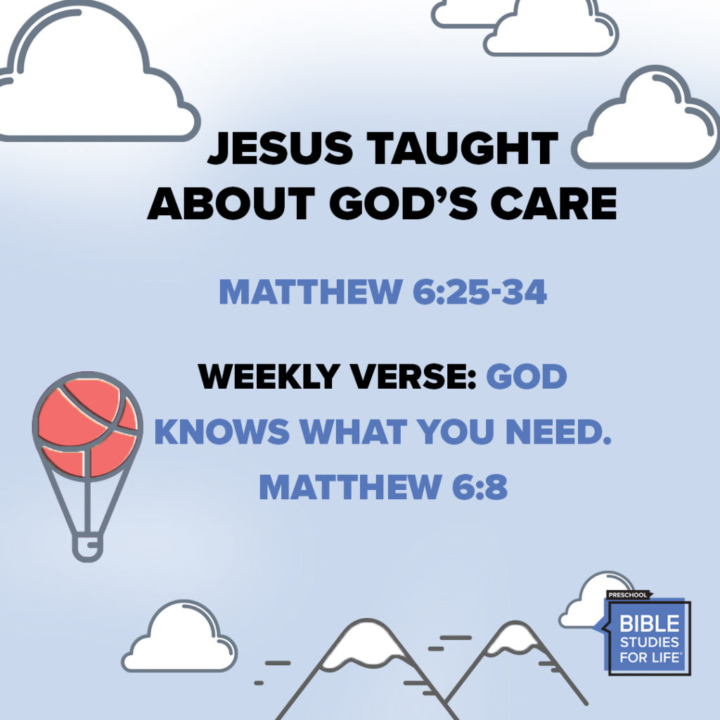 Social Media-preschool-week of March 8 Parents, today your child learned that Jesus taught about God’s care. During the Sermon on the Mount, Jesus told His disciples and others to not worry but trust God for everything they need.